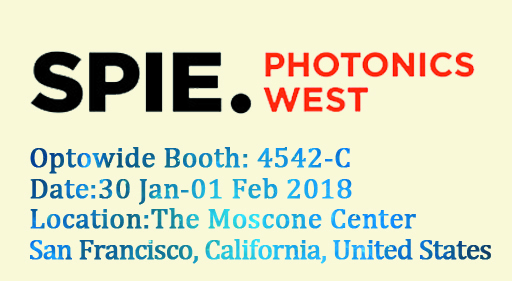 Optowide Technologies will exhibit High Power fiber Components, Optics For Laser Diode Fiber Coupling Modules, Advanced Coating&Precision Optics, 3D Sensing Filters, Optics For Bio-Medical Instrument, Molded Glass Aspheric Lens at Booth 4542-C, Jan.30-Feb.01,2018 Moscone Convention Center, San Francisco, USA.